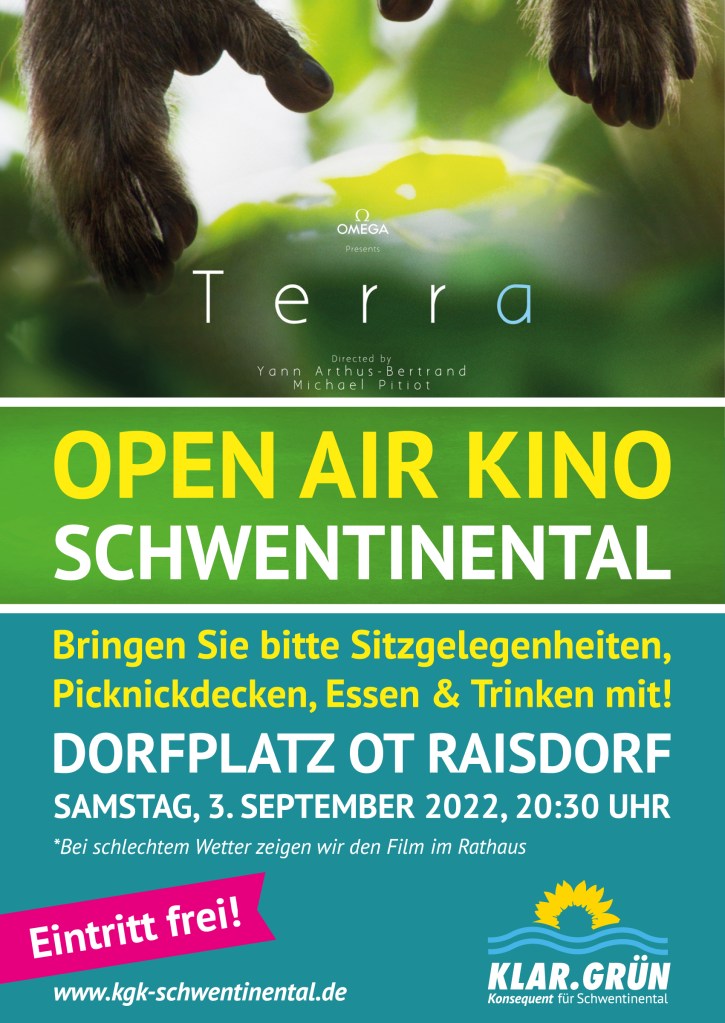 Wie mittlerweile jedes Jahr im Spätsommer veranstaltet „KLAR.GRÜN“ wieder ein Open-Air-Kino für alle interessierten Schwentinentaler. Dieses findet am Samstag, 3. September ab 20.30 Uhr auf dem Dorfplatz in Raisdorf statt. Wir zeigen den Dokumentarfilm „Terra“ von Yann-Artus Betrand. Nach „Home“ (Open Air Kino 2020 in Klausdorf) ist dies ein weiterer eindrücklicher Film des französischen Regisseurs, des Gründers der „Good-Planet-Foundation“, der seine Lebensaufgabe darin gefunden hat, mit überwältigenden Bildern, zum Teil auch aus der Luft, die Schönheit, aber auch Zerbrechlichkeit unserer Erde in Zeiten eines dramatischen Klimawandels, Verlustes der Artenvielfalt und Raubbaus an unseren natürlichen Ressourcen, darzustellen.